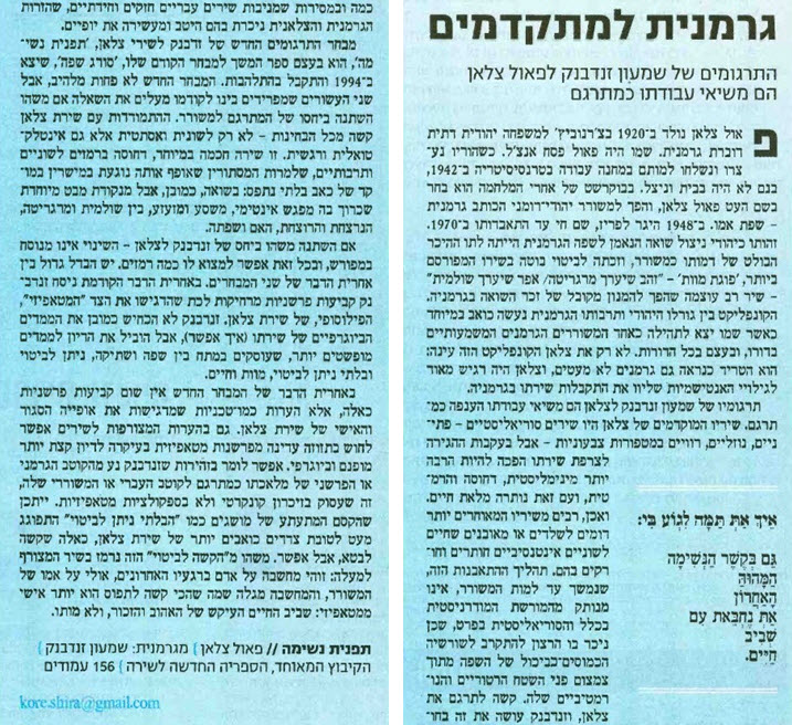 אלי הירש על תרגום זנדבנק לשירי פאול צלאן