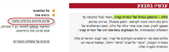 הדואר עבר לשיטת מיקוד חדשה: המיקוד הקודם הוחלף למספר בן 7 ספרות. המיקוד הקודם כבר אינו בתוקף. כדי לייעל את טיפול הדואר במשלוח הספרים, אנא היכנסו למועדון ועדכנו את כרטיס החבר שלכם. לאיתור המיקוד החדש הקליקו כאן >>